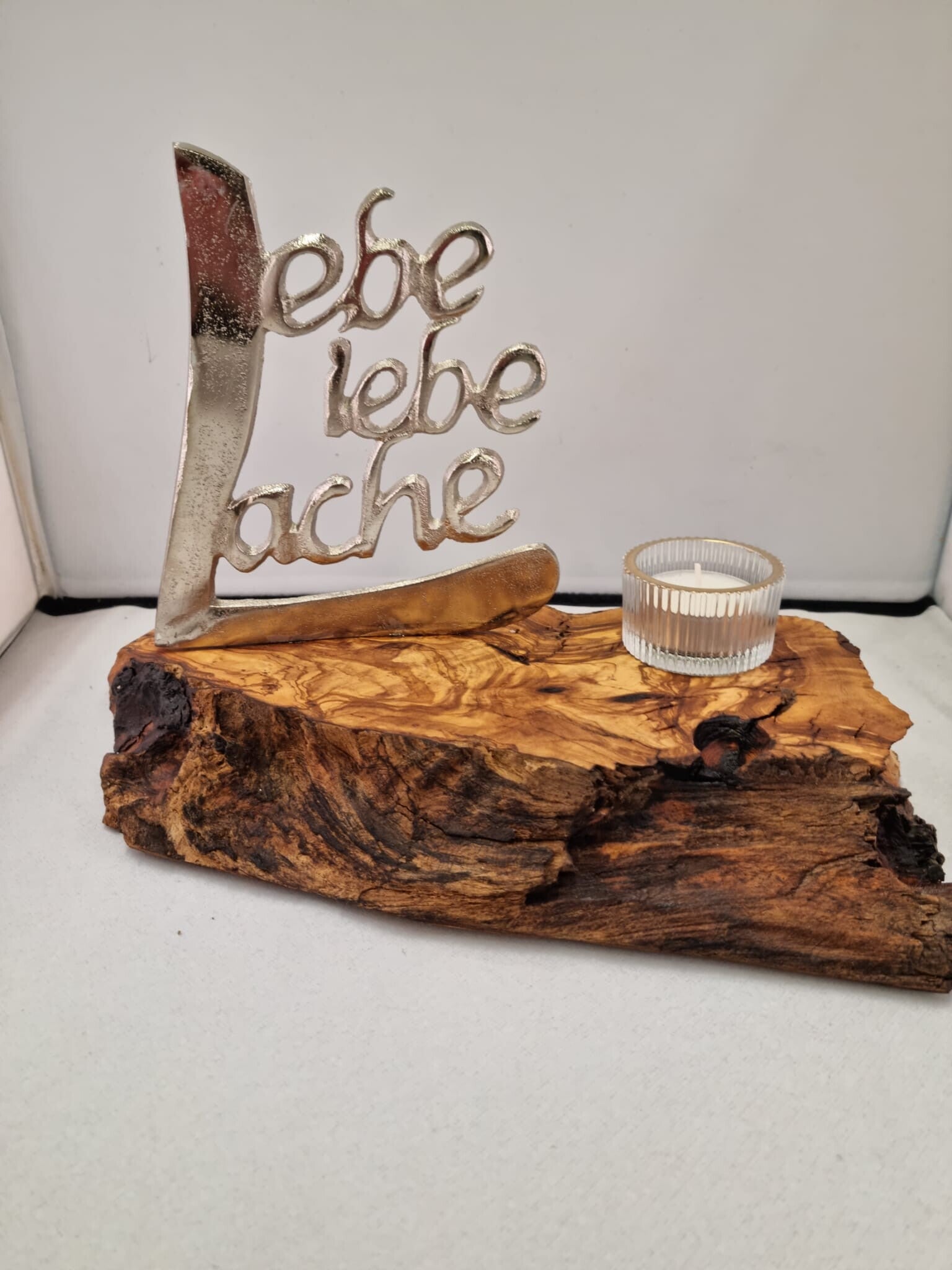 Handgearbeitetes dekoratives Olivenholz Unikat - Lebensweisheit, Lebe-Liebe-Lache aus Metall/Silber mit Teelichtglas inkl. Teelicht