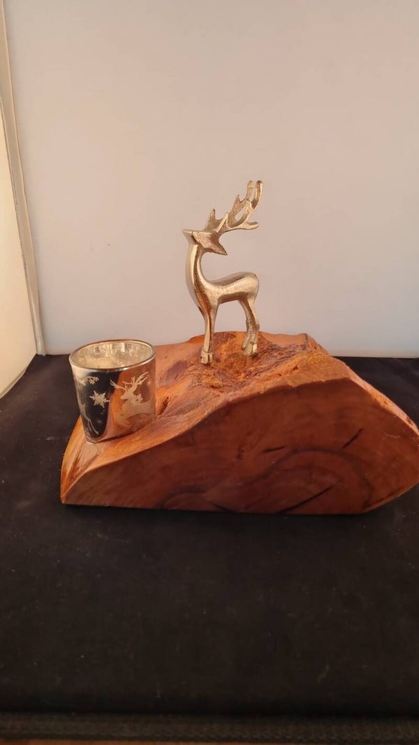 Handgearbeitetes dekoratives Echtholz Unikat - Steinkulisse mit Rentier aus Metall/Silber, Teelichtglas inkl. Teelicht